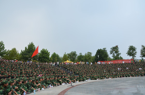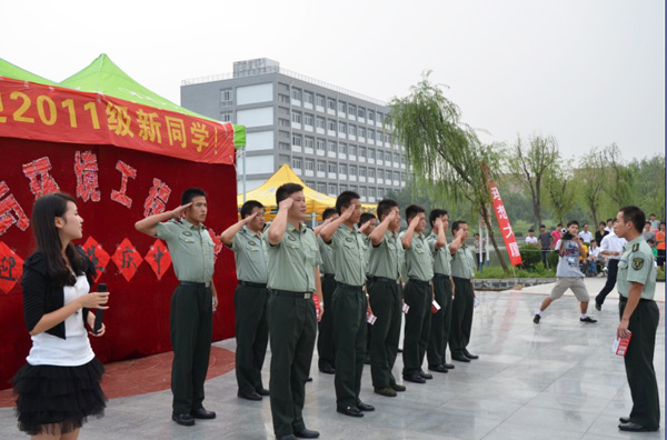 在激昂的军歌伴奏下,土木与环境工程学院2011级新生穿着整洁的军装,迈着整齐的步伐走进活动现场,分方阵就座,场面十分壮观。