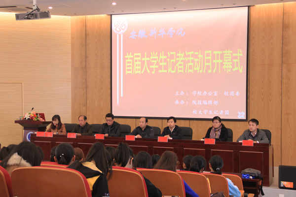 在第12个中国记者节来临之际,安徽新华学院首届大学生记者活动月正式开幕。11月8日中午,本届记者活动月开幕式在学术报告厅举行。学校办公室副主任程庆乐,《新安晚报》社首席记者、时政部主任章玉政,校团委副书记、学生处副处长马琪,文化与新闻传播学院行政副院长邵玲,《新华学院报》主编张昌顺副教授及百余名师生齐聚学术报告厅,共同探讨校园记者的成长之路。开幕式上,章玉政记者奉献了一场精彩的讲座,阐述了如何成为优秀的校园记者。