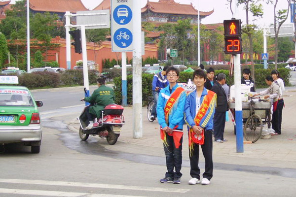 志愿者们站在各个路口认真的劝导学生遵守交通规则。闯红灯通常不是一个人,而是一群人,这就是所谓的“羊群效应”,即大家做什么,我也做什么,这就造成了志愿者在劝导工作的困难,“我们的主要责任是劝导,但还是要靠个人意识的。”一位名叫周方汉的志愿者向记者说道。