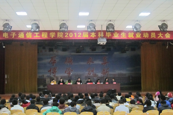12月7日,电子通信工程学院在大礼堂举办了2012届本科毕业生就业动员大会,电子通信工程学院院长江谷传、行政副院长操宏华、院长助理、行政秘书、实验室主管及各个系副主任出席大会,全体本科毕业生参加了动员大会。