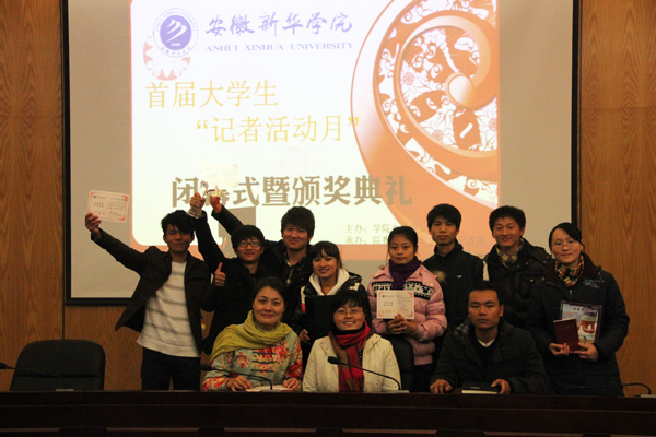 12月15日中午,安徽新华学院首届大学生“记者活动月”闭幕式暨颁奖典礼在学术报告厅举行。在此次“记者活动月”中, 文化与新闻传播学院师生积极踊跃参加,并取得优异的成绩。