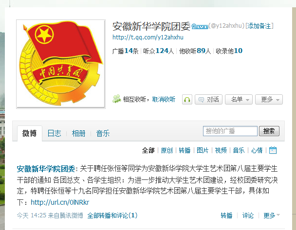 校团委腾讯微博链接:http://t.qq.com/y12ahxhu 欢迎广大师生收听、互粉!(文/王帆)