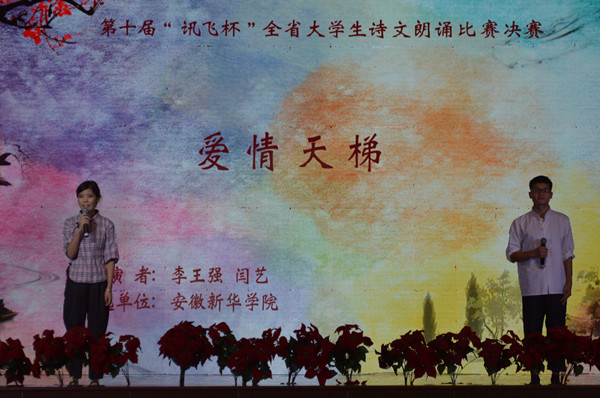 本网讯(通讯员:马兰 摄影:洪玉)11月21日,第十届“讯飞杯”全省大学生诗文朗诵比赛决赛在安徽大学磬苑校区举行。来自全省57所高校的154件朗诵作品参加比赛,我校文化与新闻传播学院播音与主持专业李王强、闫艺的《爱情天梯》荣获大赛二等奖,刘雪阳、谢圆圆的《我的南方和北方》获得优秀奖。