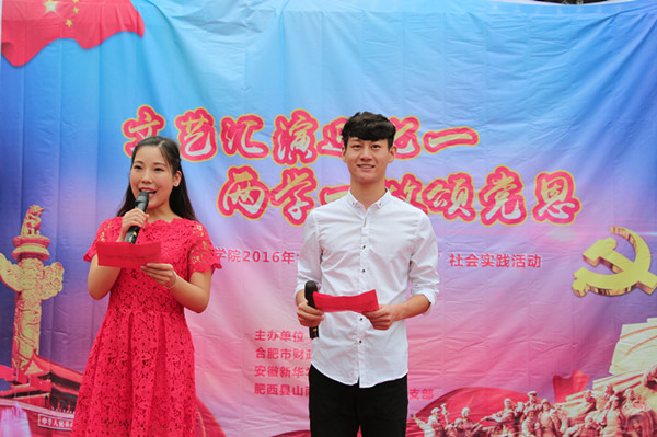实践队以反映社会主义核心价值观为主要内容,以弘扬时代精神,倡导文明新风为目标,深刻贯彻践行“两学一做”的重要精神,精心安排了两场文艺汇演。一篇《大地行吟——合肥篇》的朗诵表达了对合肥的歌颂和赞美,同时也吸引了观众的目光。现场共表演了14个节目,其中民族舞《印度新娘》、笛子演奏《美丽的神话》、黄梅戏《女驸马》《夫妻双双把家还》以及拉丁舞等节目最受村民们的欢迎,现场一段《小苹果》的舞蹈更将本次汇演推向了高潮,现场100多名观众掌声不断,喝彩连连。本次汇演不仅丰富了广大村民的业余文化生活,更展现了我校社会实践队的特色与亮点,同时也践行了“两学一做”中文艺下乡的重要精神。
