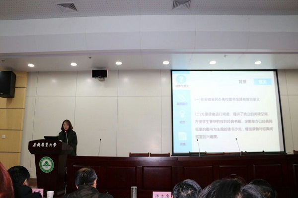 此次我校图书馆入围决赛的案例,从学生品行修养的实际需求出发,展现图书馆克服馆舍及书籍数量有限的困难,致力于促进学生全面发展的努力。为了给学生营造一个良好的阅读环境,图书馆专门在北楼三楼设置了一间经典阅览室,供学生们进行阅读以及定期举办关于经典阅读的读书沙龙活动。参赛的案例是以我校的图书馆经典阅览室作为对象,对经典阅览室的背景、意义及用途、服务对象做简要的介绍,并且对定期举办以经典阅览室的图书为主题的读书沙龙作了具体介绍。案例汇报结束后,现场评委就相关情况进行了提问,选手补充介绍了经典阅览室收集经典图书的过程以及如何为读者进行服务。我校图书馆申报的案例展示了在读者活动类方面的创新成果,得到了评委和在座教师的广泛好评,最终取得佳绩。