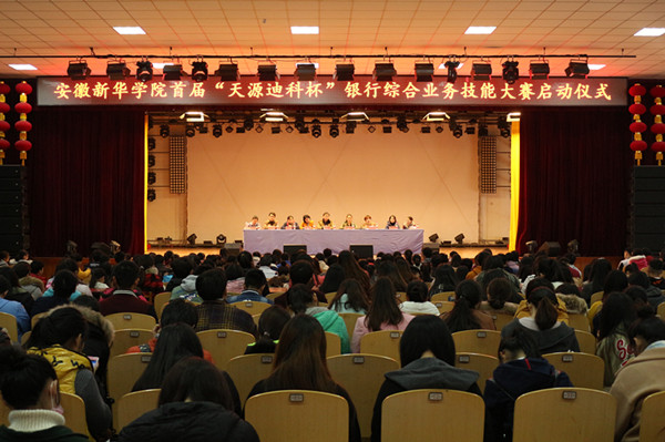 本网讯(通讯员:张璐)为加深学生对银行专业知识的理解,提高专业实际应用能力,12月2日,由财会与金融学院主办的安徽新华学院首届“天源迪科杯”银行综合业务技能大赛启动仪式在校大礼堂正式启动。财会与金融学院金融系副主任张璐和贾婷婷担任本次大赛的总策划,李会、王磊、周双艳等7位指导教师,财经类相关专业全体参赛学生参加了启动仪式。