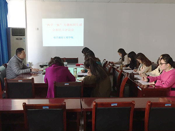 本网讯(通讯员:杨婷婷)3月1日下午,电子通信工程学院党总支组织召开“两学一做”专题组织生活会。电子通信工程学院全体党总支委员和各支部书记参加会议。会议由电子通信工程学院党总支副书记吕翔主持。