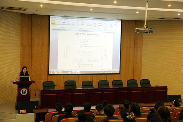 会议伊始,宣传处处长助理代玲玲宣读了《安徽新华学院网络新闻发布规定》,向在场听众介绍了校园网新闻发布的注意事项及准则。