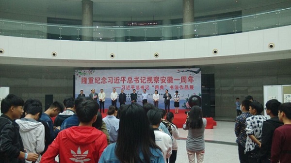 本网讯(通讯员:江健龙)4月25日,由中共合肥市委宣传部、合肥市文联隆重举办的纪念习近平总书记视察安徽一周年——习近平总书记“用典”书法作品展在市政务中心阳光大厅隆重开幕。市委常委、宣传部部长钟俊杰出席开幕式并讲话。阚建华、吴春梅、金其武等市领导和数百名市民及安徽新华学院动漫学院的师生代表共同参加了开幕式。