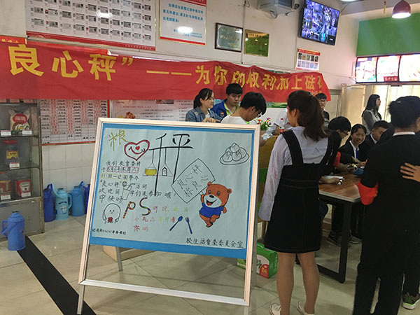 本网讯(通讯员:谭玲) 为提升师生日常就餐的维权意识,加强对食堂的监督管理,在总务处的安排指导下,5月6日中午,校生活督查委员会的同学们在我校中快食堂开展了以“良心秤,为你的权利加上砝码”为主题的校园就餐维权公益活动。