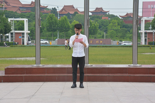 入团宣誓仪式在雄壮的国歌歌声中拉开序幕。首先,主持人介绍了共青团的团旗、团徽组成、团歌等团的基本知识。随后,老团员代表校团委志愿服务工作部董勇发言,作为一名参加过数次志愿服务活动志愿者,他倡导同学们将自己的力量和爱心献给团组织,希望团员能承担起一名团员该承担的责任,以己为中心向外传达意愿,为更多的同学起到模范带头作用,把团组织建设的更好。新团员代表由此被感染,产生了作为一名团员是如此无比光荣与自豪的感悟,同时也表示自己和广大团员身上背负着团的重任,寄托着团的希望。文化与新闻传播学院新团员代表宋广汉郑重承诺自己将会用优良的言行来实践誓词,成为遵守纪律的标杆、勤奋学习的模范,树立好团员的鲜明形象,力争成为一名优秀的共青团员。入团应该是团员同学崭新的起点,而不是奋斗的终点,人生的道路上还有很多目标去实现。最后,全体团员在校团委组织部部长韩敦旺带领下宣誓,会牢记自己是一名共青团员,让共青团员的光荣永驻,让胸前团徽光芒闪耀,共青团荣耀永不散场。