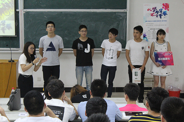 宣讲会现场,合肥万科企业股份有限公司人力资源部经理汪贵平首先播放了一则宣传片,以视频的形式向同学们介绍了万科企业股份有限公司几十年的发展史,强调万科企业的人文关怀和对运动的崇尚。现场更是来了一场平板撑大比拼,在场的学生均被氛围感染,跃跃欲试,比赛结束后,汪贵平为坚持到最后的五位同学赠送小礼物。