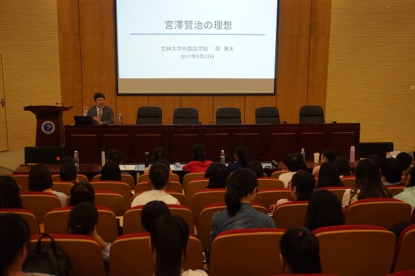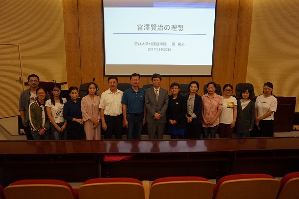 本网讯(通讯员:赵明)9月24日下午,外国语学院联合学校科研处邀请中国日语教学研究会会长、吉林大学外国语学院院长、教授、博士生导师周异夫教授在校学术报告厅为我校师生开展“亚洲共同体”系列学术讲座第四讲——“宫泽贤治的理想”学术报告。科研处副处长张帆、外国语学院执行院长邵玲及日语系全体师生共计一百余人出席聆听。本场讲座由日语系系主任宋志强主持。