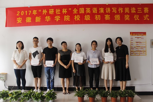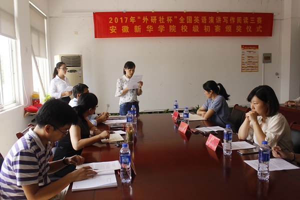 本网讯(通讯员:柳飏)为鼓励学生将专业知识运用到实践中,激发学生积极参加各类学科竞赛,近日,外国语学院举办2017年“外研社杯”全国英语演讲、写作及阅读三赛安徽新华学院校级初赛颁奖仪式。外国语学院执行院长邵玲、教学副院长王志宏、行政副院长周景及相关教师出席了颁奖仪式。