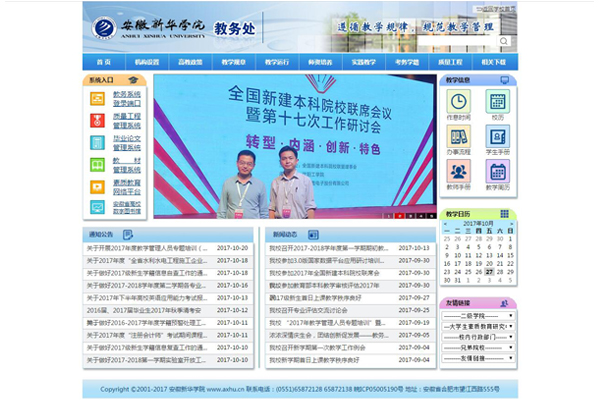 本网讯(通讯员:方骥飞)为了进一步服务广大师生,经过两个月的设计与制作,安徽新华学院教务处新版网站(http://www.axhu.cn/jwc/)于10月27日正式上线运行。
