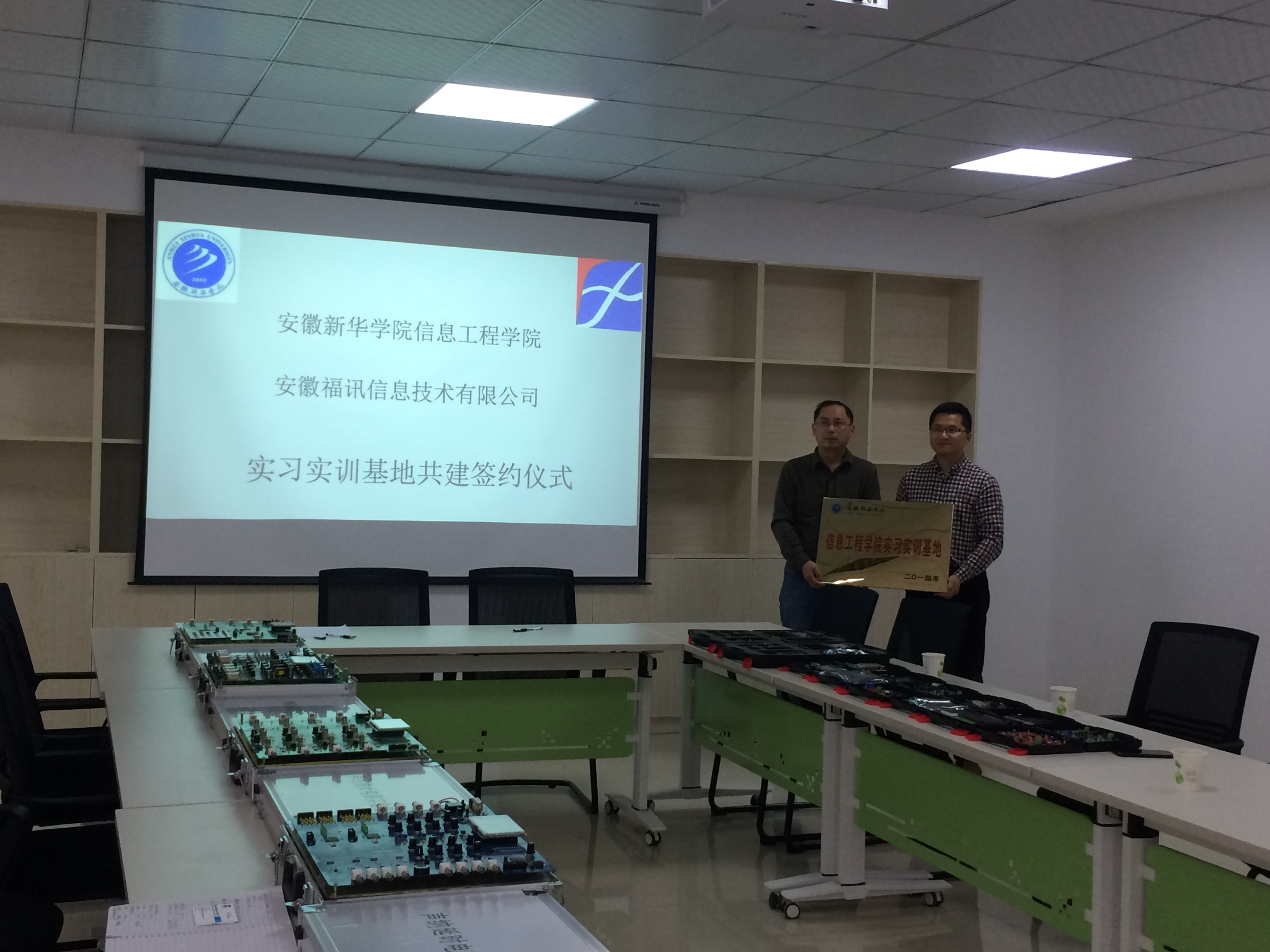 本网讯(通讯员:朱学玲 )10月26日下午,信息工程学院与安徽福讯信息科技有限公司实习实训基地签约暨揭牌仪式在安徽福讯信息科技有限公司举行,信息工程学院执行院长贺行佳、副院长万家华、安徽福讯信息科技有限公司副总经理刘安勇、市场部经理刘志娟等出席了仪式。