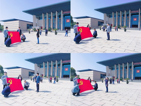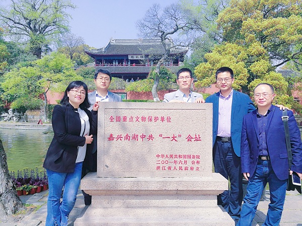 嘉兴南湖是中国共产党的诞生地。“南湖革命纪念馆”外观典雅而宏伟,中国共产党党徽高高地悬挂在纪念馆正门中央。门前一块白色雕塑上刻着“不忘初心、牢记使命。”南湖革命纪念馆记载着中国革命历史,昭示后人传承“开天辟地、敢为人先”的红船精神,“坚定理想、百折不挠”的奋斗精神,“立党为公、忠诚为民”的奉献精神。在纪念馆的正门前,邵玲带领党员同志面对党旗重温了入党誓言。