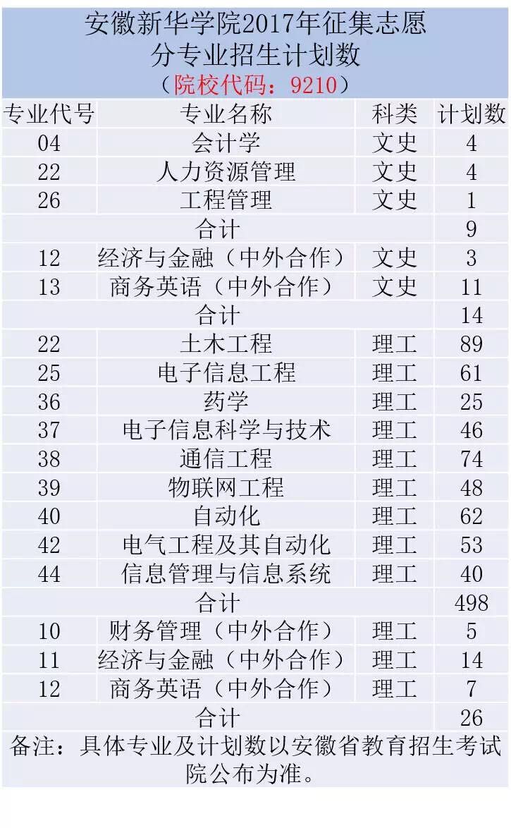 根据2017年安徽省高招录取工作安排,安徽本科二批即将进入征集志愿阶段。我校本科二批文科、理科以及中外合作类均有部分缺额征集计划,理科达393分以上、文科达420分以上尚未被录取的考生请于8月1日10:00-16:00登录安徽省教育招生考试院官方网站查询具体征集分专业计划并填报征集志愿。我校具体招生专业和计划如下表: