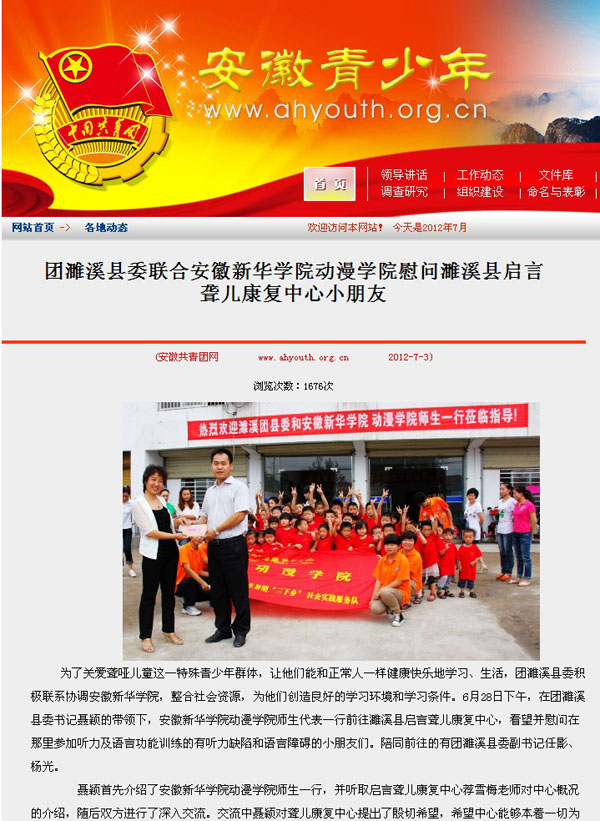 我校动漫学院暑期三下乡社会实践队联合淮北市濉溪团县委慰问濉溪县启言聋儿学校的孩子们活动,受到安徽省团省委的高度关注,团省委领导通过濉溪县团县委向我校动漫学院师生发来了慰问和感谢,活动的新闻稿件也被安徽省青少年门户网站于7月3日第一时间转载。