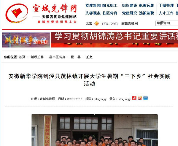 此外,安徽青年报、宣城先锋网、泾县新闻网等媒体均对我校此次实践活动进行了重点报道。报道中指出“安徽新华学院大学生暑期社会实践队开展的学雷锋志愿服务、送文艺下乡等活动深受泾县广大基层群众好评。其中,连续五场演出、观看群众达3000多人的送文艺下乡活动一度在当地引起轰动。此外,实践队挖掘出当地典型人物4个以及他们的感人事例。这其中包括在战争年代为新四军巧送信的朱金花老人,参加过抗美援朝的吴守琪老人,用退休工资投入家乡建设的吴慧智老人以及热心助人并广受邻里称赞的吴满华大哥。另外,实践队开展的农村社会调研活动取得了实质性的成果,大学生们把群众最关心的问题反映给当地镇政府领导,其中有关配备洒水车的建议已经得到镇政府采纳与解决。安徽新华学院大学生以他们良好的精神面貌向基层群众展示了当代大学生关注社会关心农村关爱农民的高尚品质。”