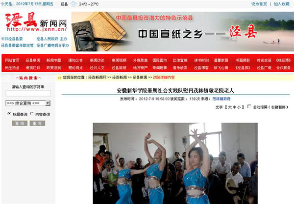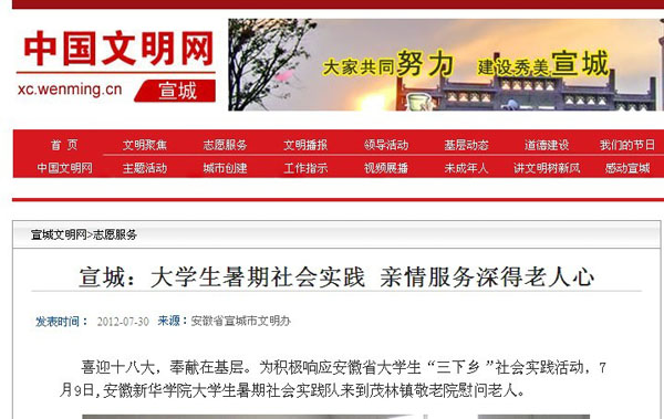 2012暑假,我校大学生赴老区泾县茂林镇社会实践活动在当地引起了强烈反响。近日,“中国文明网”以专题形式重点报道了实践队开展的关爱孤寡老人活动,并给与了高度评价。