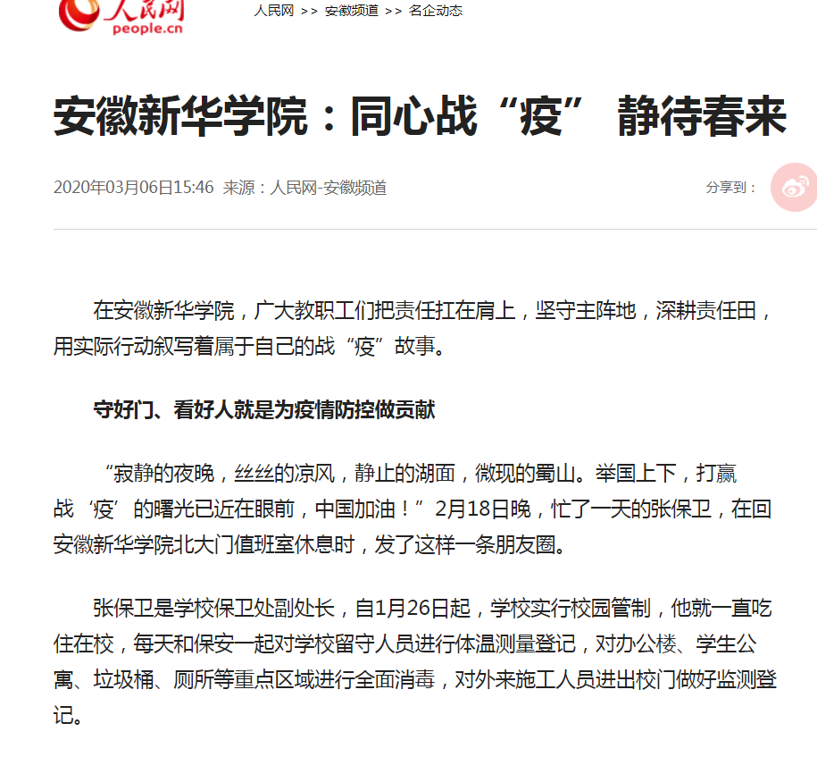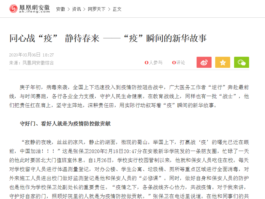 近日,多家主流媒体对安徽新华学院:同心战“疫” 静待春的战“疫”故事进行了全面报道。