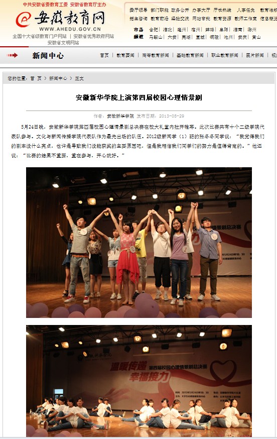 安徽教育网:安徽新华学院上演第四届校园心理情景剧