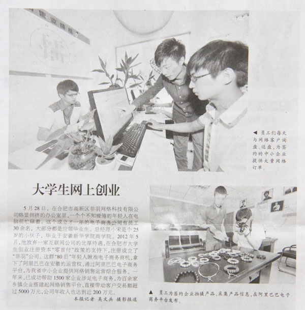 5月28日,在合肥市高新区非羽网络科技有限公司略显拥挤的办公室里,一个个不知疲倦的年轻人在电脑前忙碌着。这个成立才一年的电子商务公司有员工30余名,大部分都是应届毕业生。总经理小宋是个25岁的小伙子,毕业于安徽新华学院商学院。2012年5月,他放弃一家互联网公司的优厚待遇,在合肥市大学生创业注册资本“零首付”政策的支持下,注册成立了“非羽”公司。这群“80后”年轻人瞅准电子商务商机,拿下了阿里巴巴在安徽的运营权,通过阿里巴巴电子商务平台,为我省中小企业提供网络销售运营综合服务。一年来,已成功帮助1500家企业涉足电子商务,为百余家乡镇企业搭建起网络销售平台,直接带动客户交易额超过5000万元,公司年收入也达到近200万元。