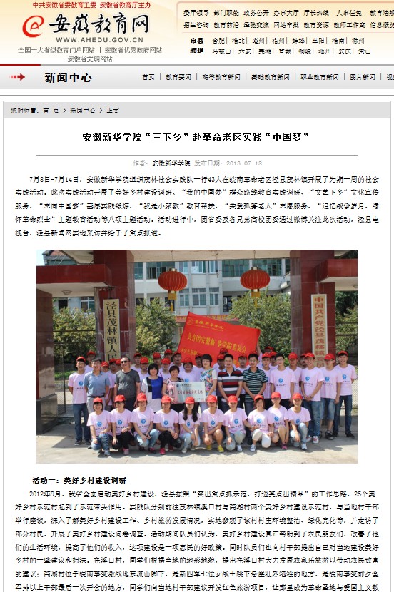 安徽教育网:安徽新华学院“三下乡”赴革命老区实践“中国梦”
