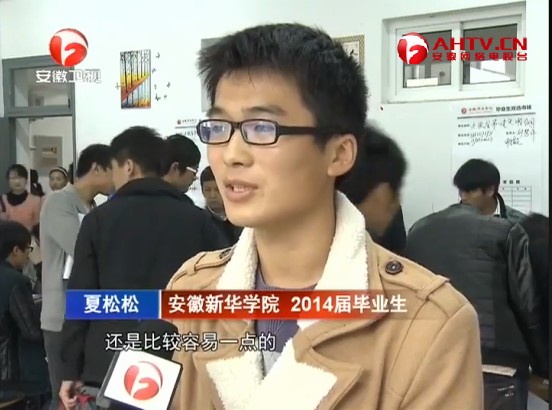安徽新华学院2014届毕业生夏松松:基本上我们找工作还是比较容易一点的,只不过好一点有点压力,竞争比较激烈。