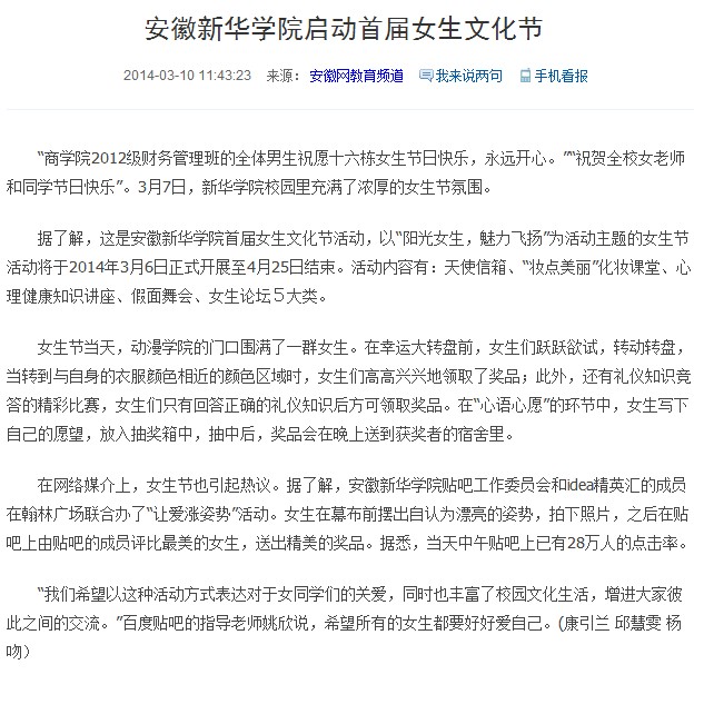 安徽网:安徽新华学院启动首届女生文化节