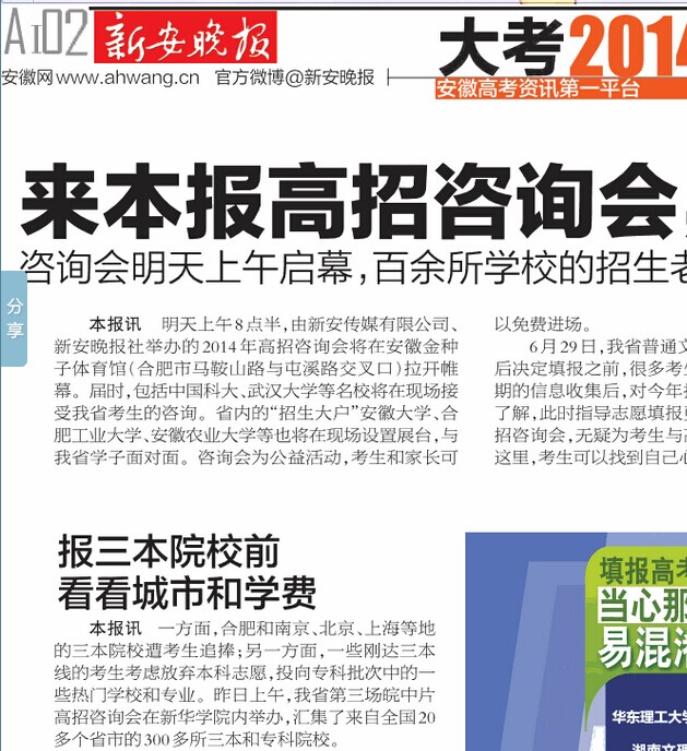 新安晚报:报三本院校前看看城市和学费