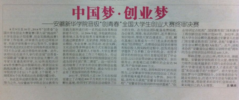 新安晚报:中国梦.创业梦——我校晋级“创青春”全国大学生创业大赛终审决赛