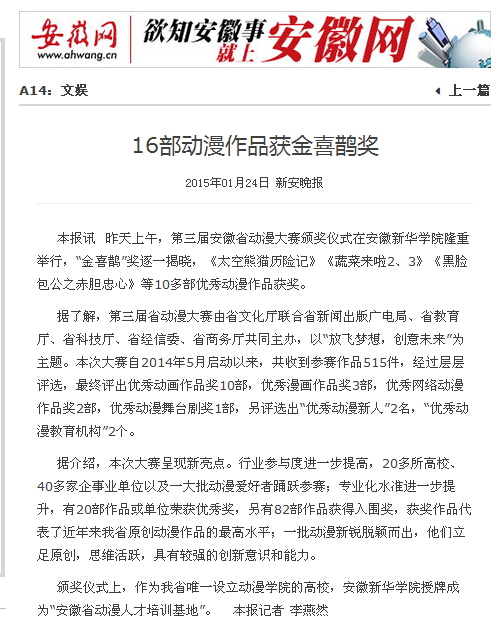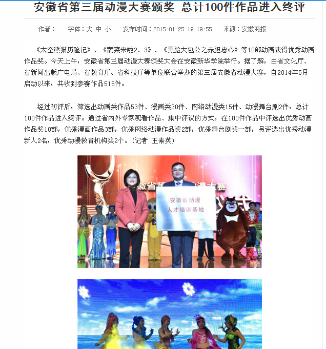 安徽日报、新安晚报、安徽商报、中安在线报道我校承办安徽省第三届动漫大赛“金喜鹊”颁奖仪式