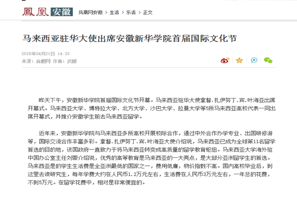 凤凰安徽:马来西亚驻华大使出席安徽新华学院首届国际文化节、马来西亚五所名高校来皖揽学子 驻华大使助阵