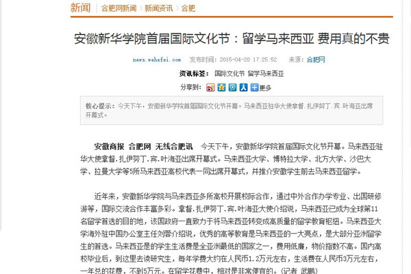 合肥网:安徽新华学院首届国际文化节 留学马来西亚 费用真的不贵