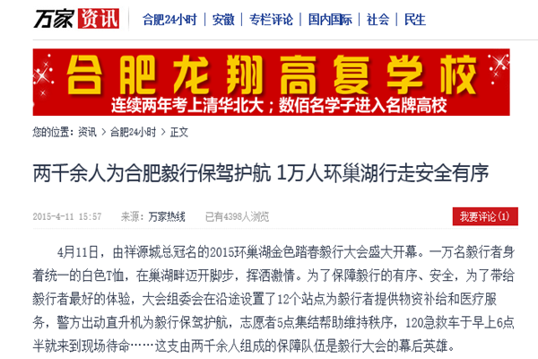 万家资讯:两千余人为合肥毅行保驾护航 1万人环巢湖行走安全有序、2015合肥毅行大会物资发放圆满结束 毅行者现场开心合影