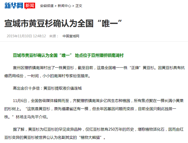 新华网:宣城市黄豆杉确认为全国“唯一”