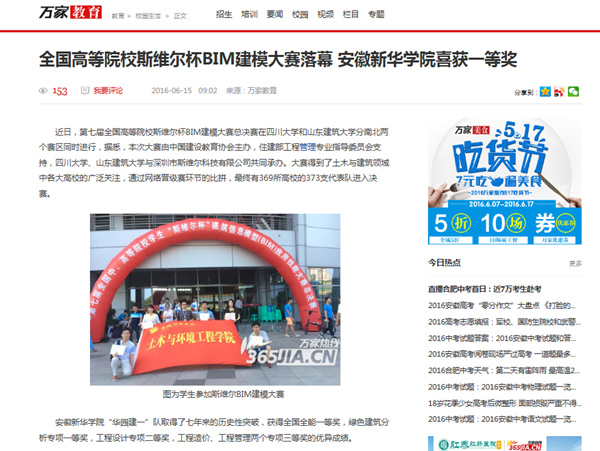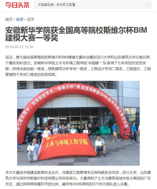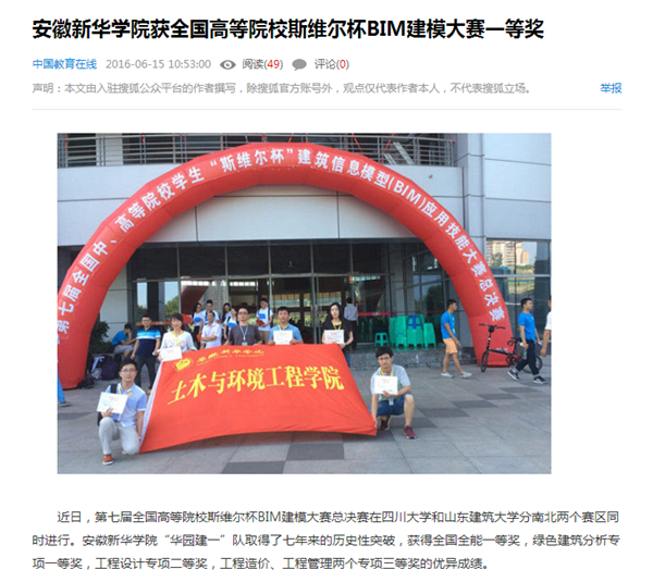 中国教育在线、搜狐网、今日头条、万家热线:安徽新华学院获全国高等院校斯维尔杯BIM建模大赛一等奖