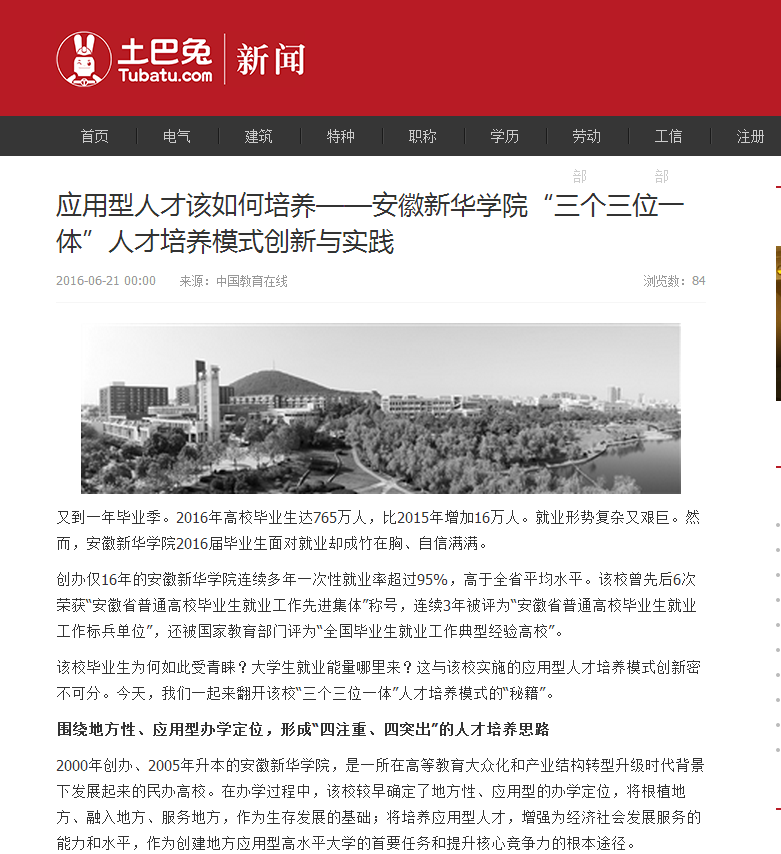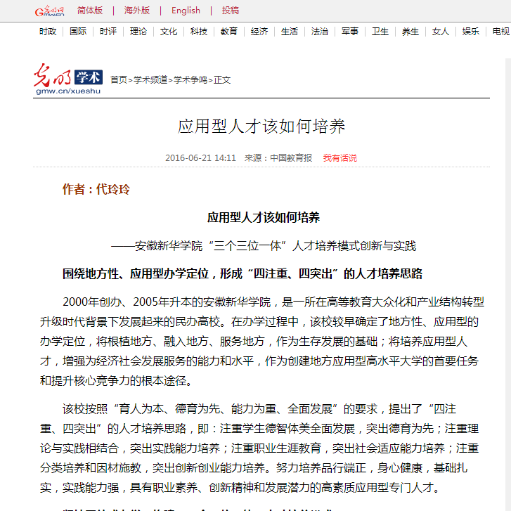 光明网、中国教育在线、搜狐网、中国网传媒经济、土巴兔新闻:应用型人才该如何培养——安徽新华学院“三个三位一体”人才培养模式创新与实践