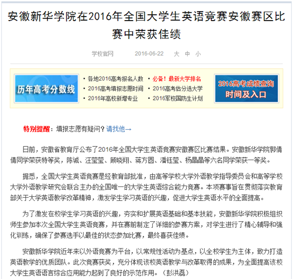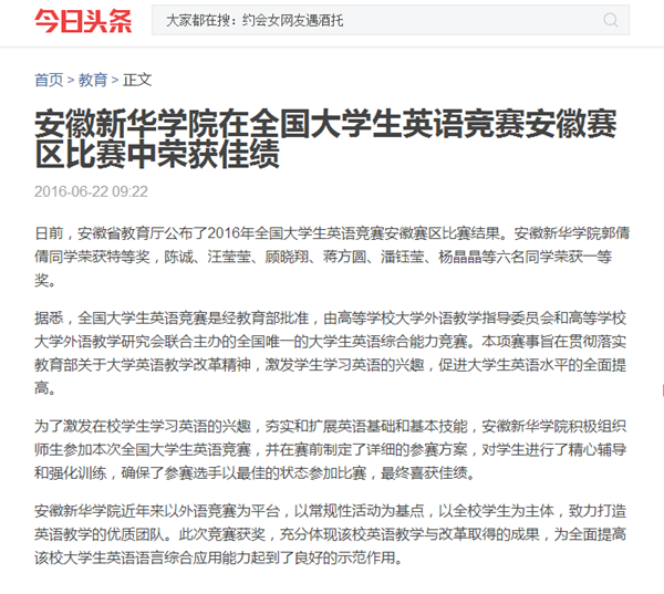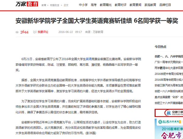 中国教育在线、今日头条、万家热线:安徽新华学院在2016年全国大学生英语竞赛安徽赛区比赛中荣获佳绩
