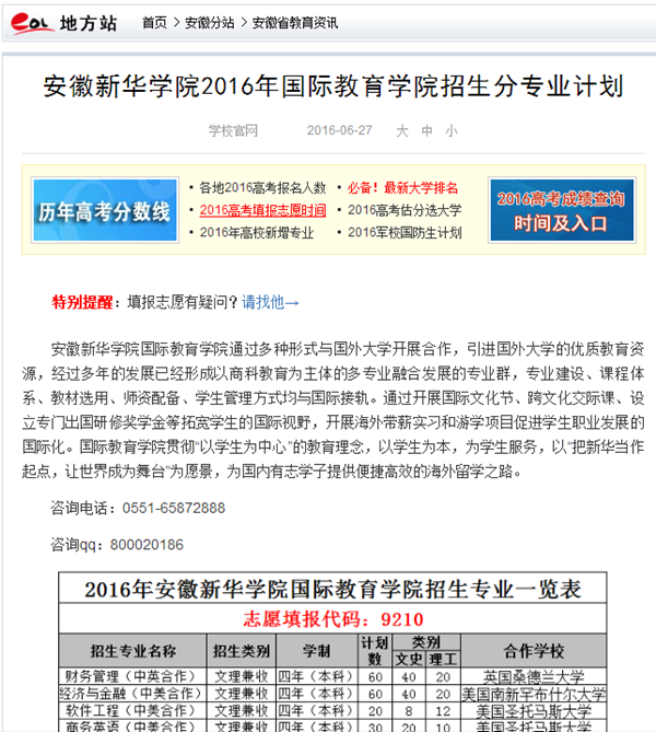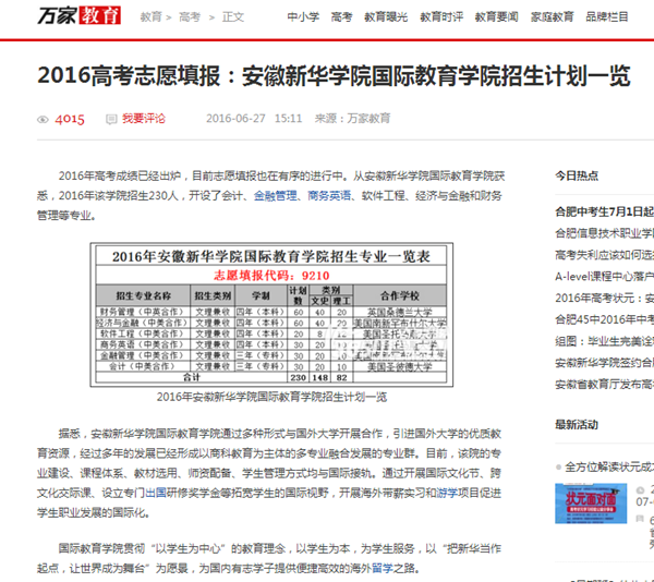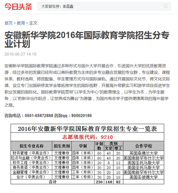 中国教育在线、今日头条、万家热线:安徽新华学院2016年国际教育学院招生分专业计划