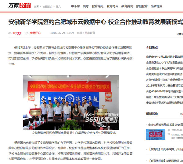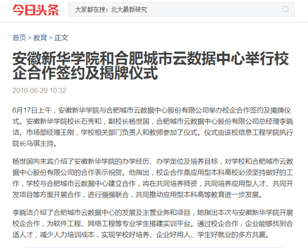 今日头条、搜狐网、万家热线:安徽新华学院和合肥城市云数据中心举行校企合作签约及揭牌仪式