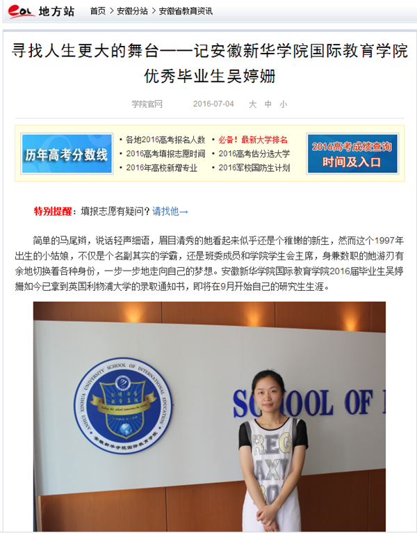 中国教育在线:寻找人生更大的舞台——记安徽新华学院国际教育学院优秀毕业生吴婷姗