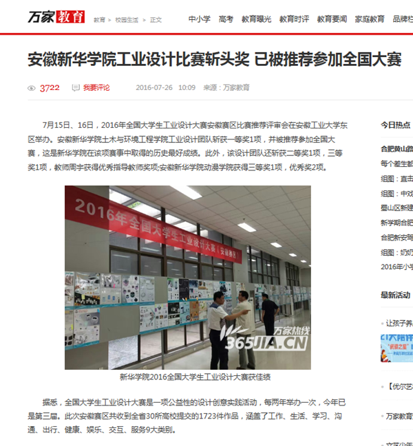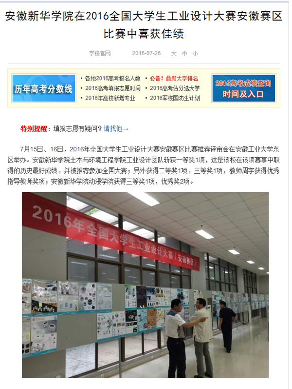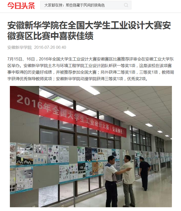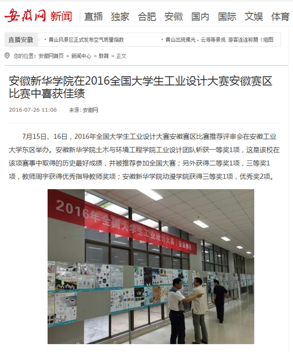 中国教育在线、今日头条、安徽网、万家热线、UC头条、新安晚报微博:安徽新华学院在2016全国大学生工业设计大赛安徽赛区比赛中喜获佳绩