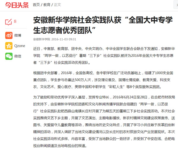 今日头条:安徽新华学院社会实践队获“全国大中专学生志愿者优秀团队”