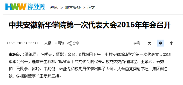海外网:中共安徽新华学院第一次代表大会2016年年会召开