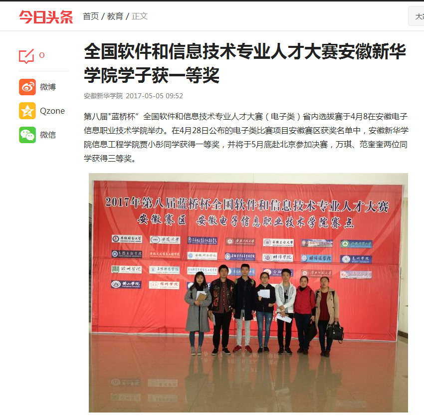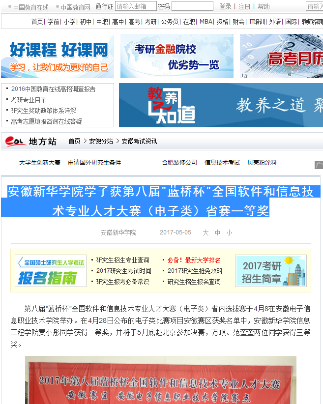 中国教育在线、今日头条:安徽新华学院学子获第八届"蓝桥杯"全国软件和信息技术专业人才大赛(电子类)省赛一等奖
