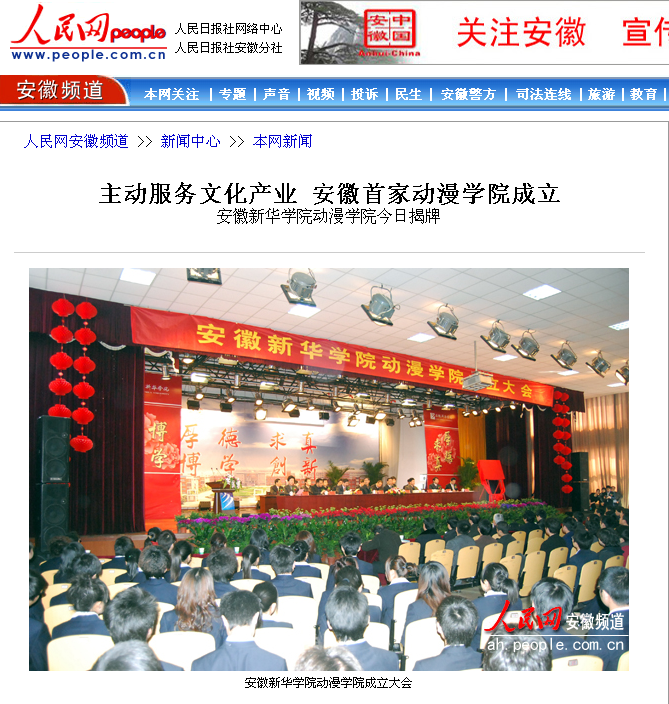 《人民网》:主动服务文化产业 安徽首家动漫学院成立——安徽新华学院动漫学院今日揭牌