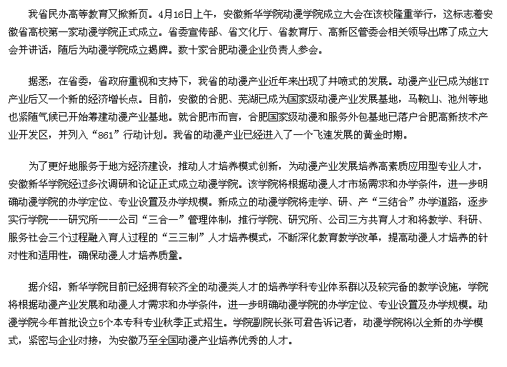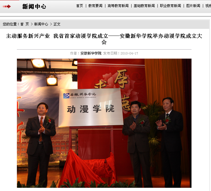 《安徽教育网》:主动服务新兴产业 我省首家动漫学院成立——安徽新华学院举办动漫学院成立大会